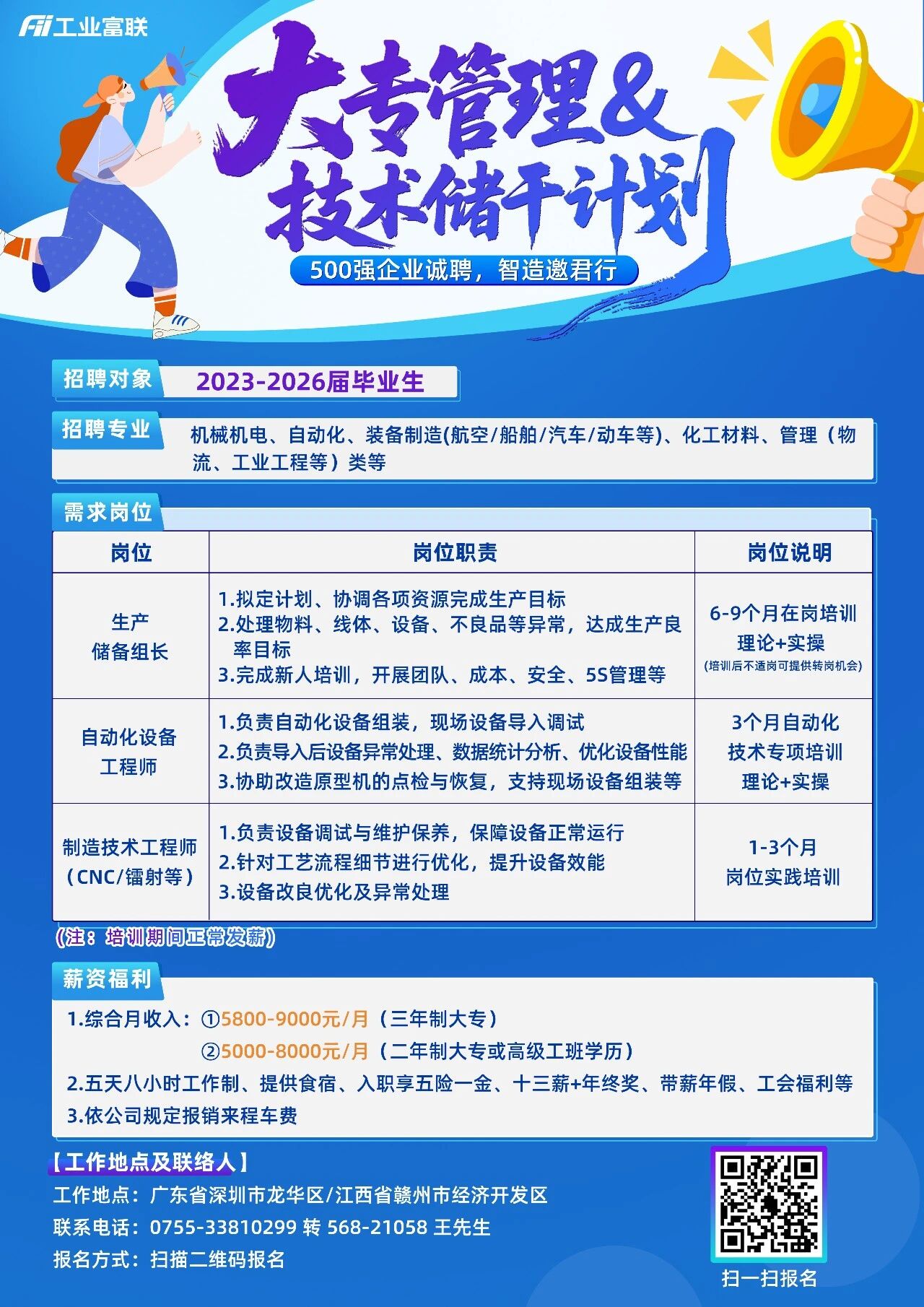 工作地点:广东省深圳市龙华区/江西省赣州市经济开发区联系电话:0755-33810299 转 568-21058 王先生报名方式:扫描二维码报名